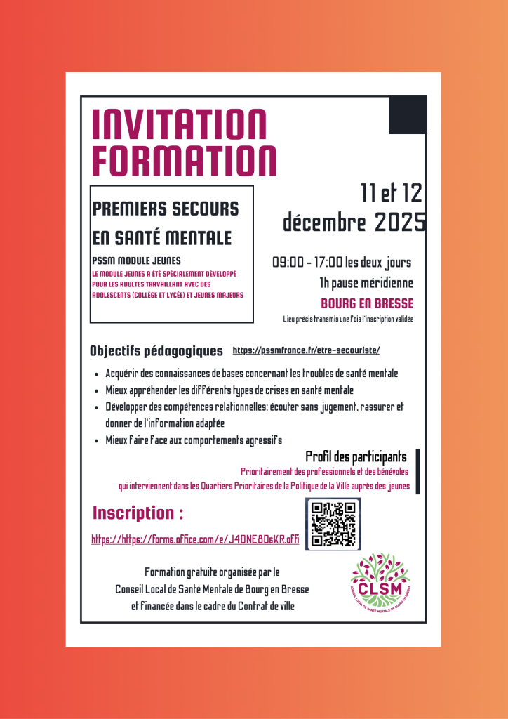 Le module Jeunes a été spécialement développé pour les adultes travaillant avec des adolescents (collège et lycée) et jeunes majeurs.. Pour plus d’information sur cette formation vous pouvez consulter les informations sur le site Premiers Secours en Santé Mentale France : https://www.pssmfrance.fr/etre-secouriste/#formation