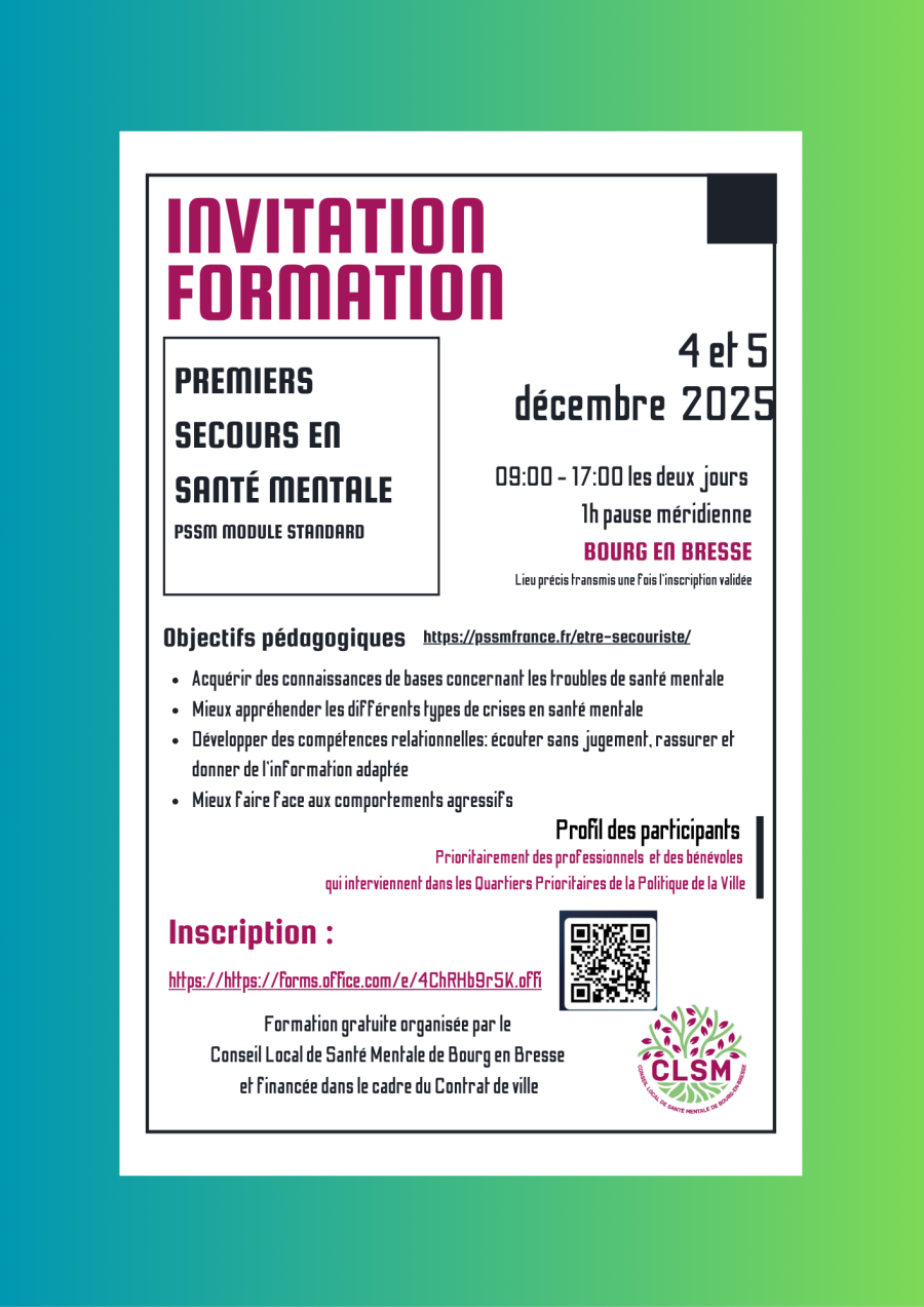 Afin de sensibiliser à la santé mentale (information, repérage, aide à l’orientation), le Conseil Local de Santé Mentale de BOURG EN BRESSE propose une formation « Premiers Secours en Santé Mentale »,
