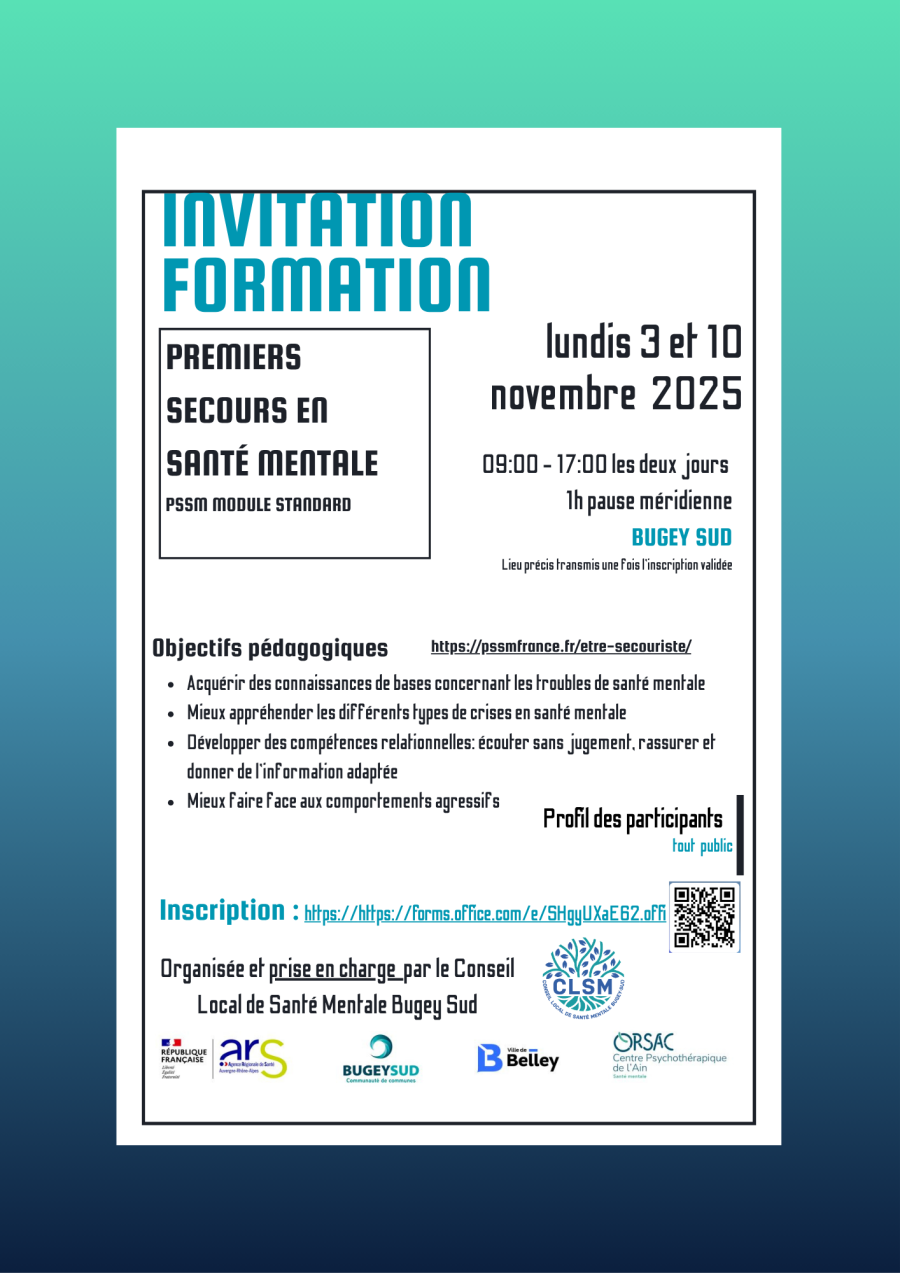 Cette formations est prise en charge par le CLSM BUGEY SUD (coûts pédagogiques : livrets, intervenant et ses frais annexes), nos partenaires mettent à disposition une salle pour la partie logistique.